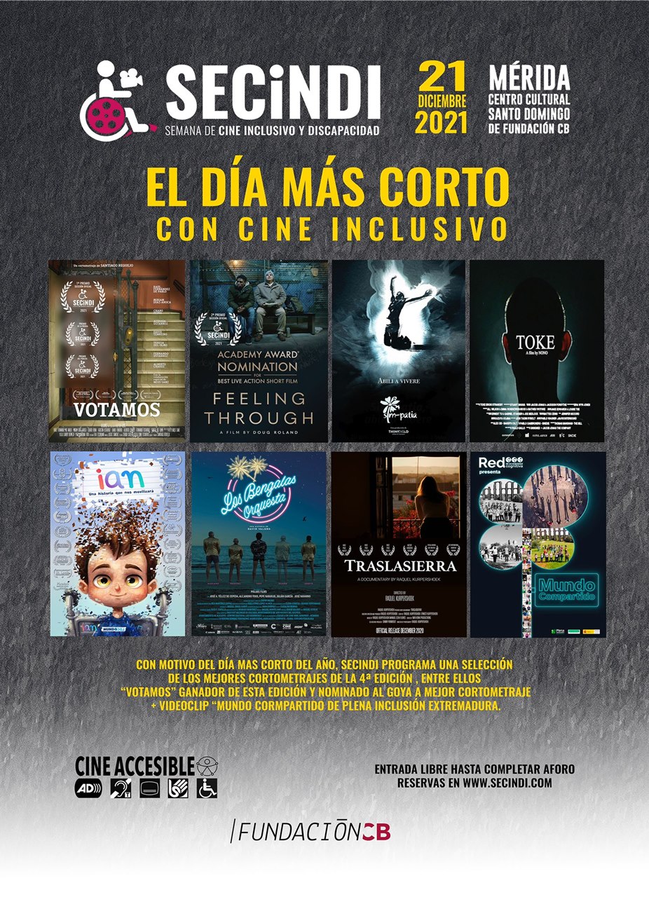 Con motivo de la celebración del día más corto del año, el 21 de diciembre, SECINDI programa una sesión de cortometrajes con una selección de la Sección Oficial de la pasada edición 2021, entre ellos el corto ganador “Votamos”, actualmente nominado a los Premios Goya. Se trata de una actividad de cine inclusivo que pretende potenciar el cortometraje, sumándose a muchas otras acciones relacionadas con el cortometraje que se celebrarán en toda España. A las 11:00 horas, en el Centro Cultural Santo Domingo de Fundación CB. Entrada libre hasta completar aforo.