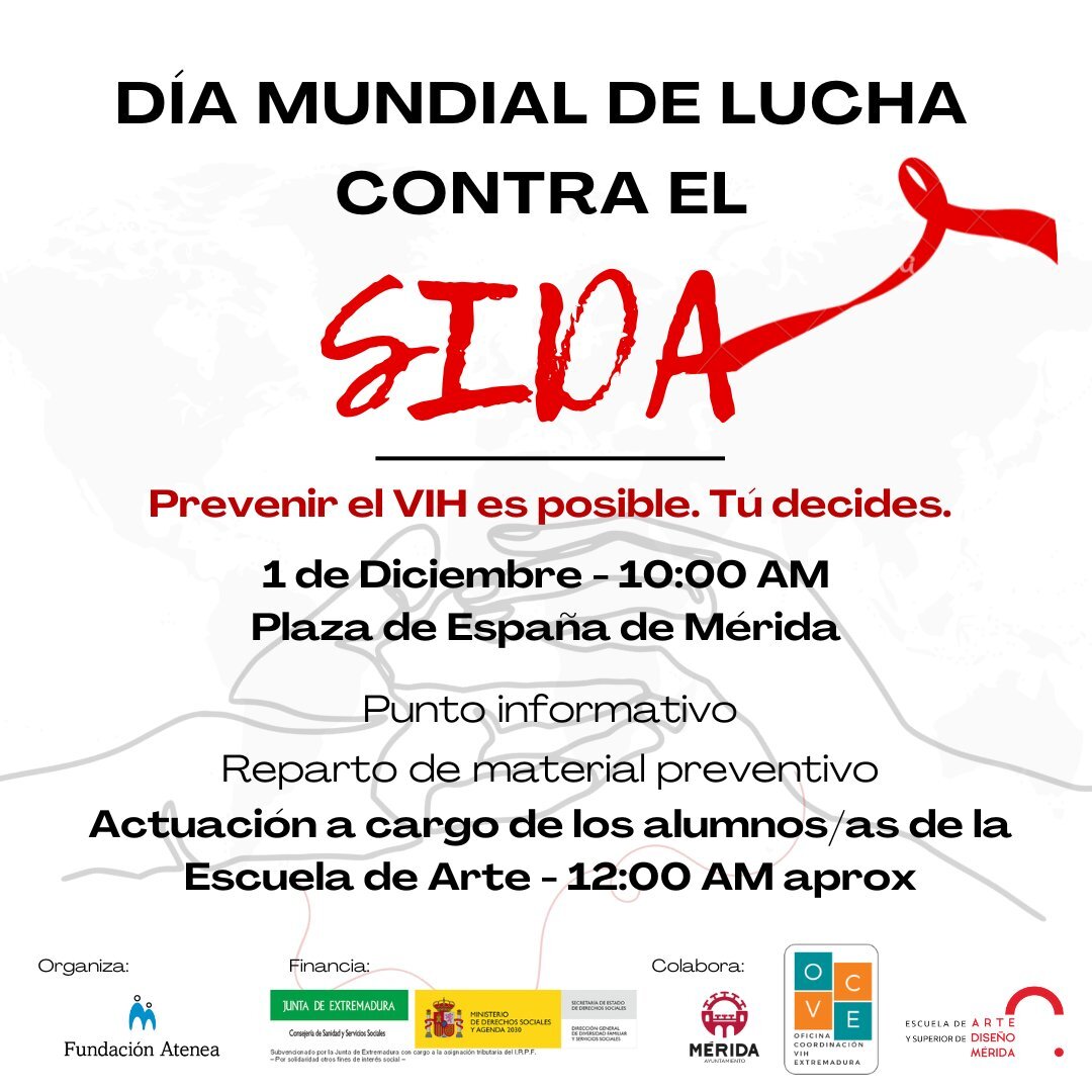 Mérida se suma a la conmemoración del Día Mundial del Sida, que tendrá lugar el próximo viernes, 1 de diciembre con la representación de una performance, con música en directo y temática sobre VIH/sida, en la Plaza de España, a las 12:00 horas. Organiza: Fundación Atenea. Colabora: Escuela de Arte y Superior de Diseño de Mérida.
