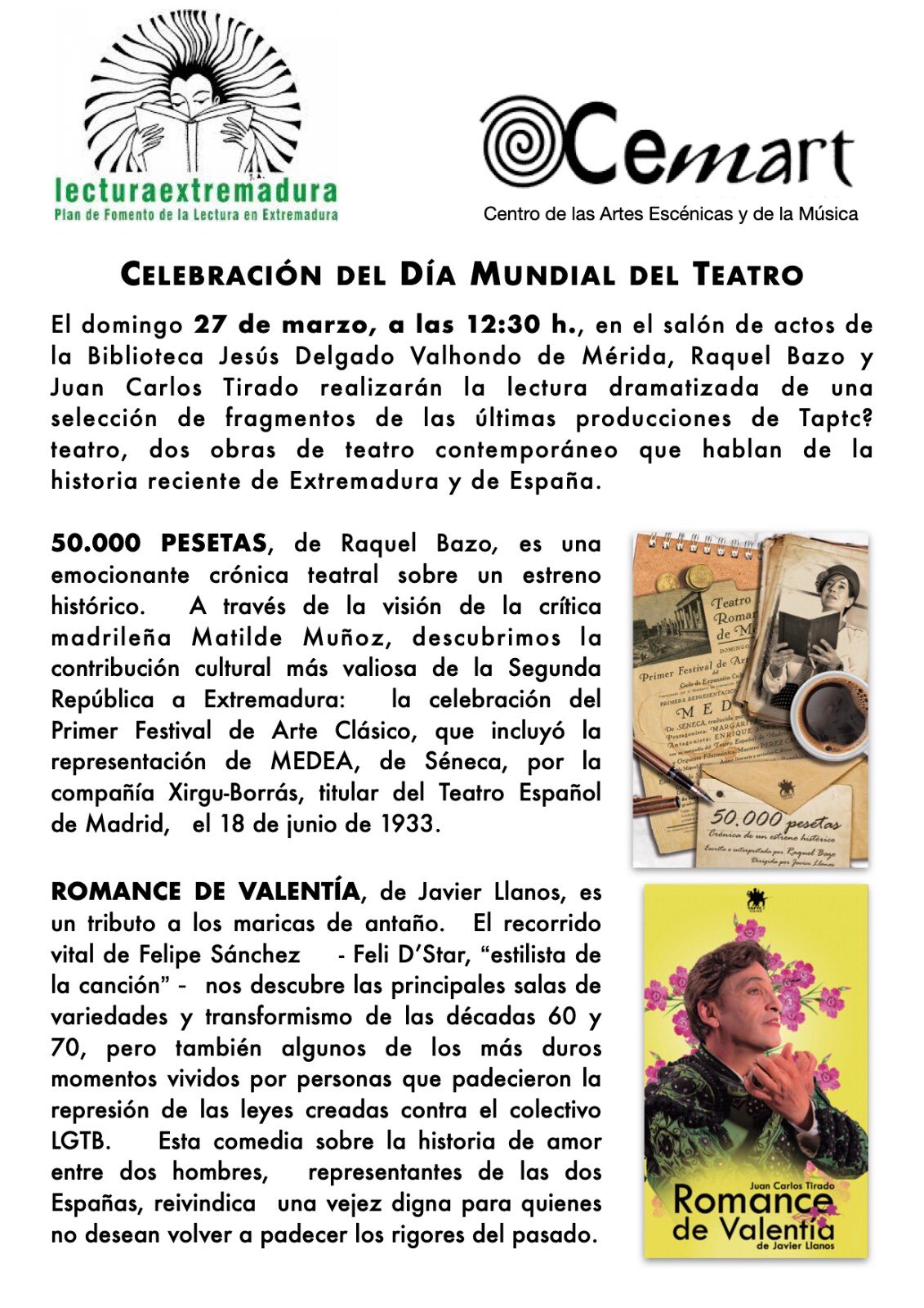 Con motivo del Día Mundial del Teatro, el domingo 27 de marzo, se podrá disfrutar en la Biblioteca Pública del Estado ‘Jesús Delgado Valhondo’, a partir de las 12:00 horas, de una lectura dramatizada de diversos textos. Por un lado, la actriz Raquel Bazo leerá el texto ’50.000 pesetas’, de la que es autora, y el actor y dramaturgo Juan Carlos Tirado hará una revisión sobre el texto ‘Romance de Valentía’ en un acto organizado por el Plan de Fomento de la Lectura en Extremadura y el CEMART de la Junta de Extremadura