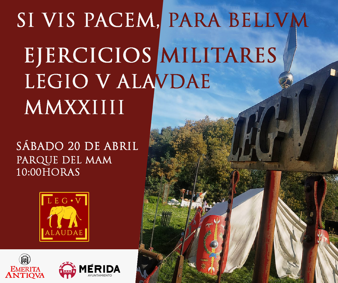 El parque junto al Museo Abierto de Mérida MAM acoge el sábado 20 de abril, a partir de las 10:00 horas, Ejercicios Militares de la Legio V Alavdae organizados por la Asociación Cultural Emerita Antiqua como parte de los preparativos para la próxima edición de Emerita Lvdica