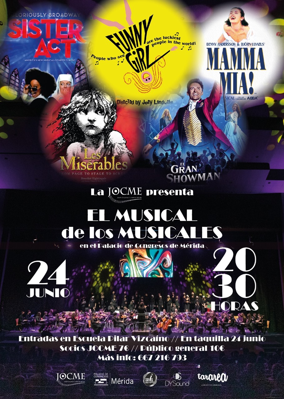 El Palacio de Congresos acogerá, el viernes 24 de junio, El Musical de los Musicales, a cargo de la Joven Orquesta Ciudad de Mérida (JOCME). Entradas: 7 euros (socios), 10 euros (público en general). A la venta en la Escuela de Música Pilar Vizcaíno. Más información: 667216793