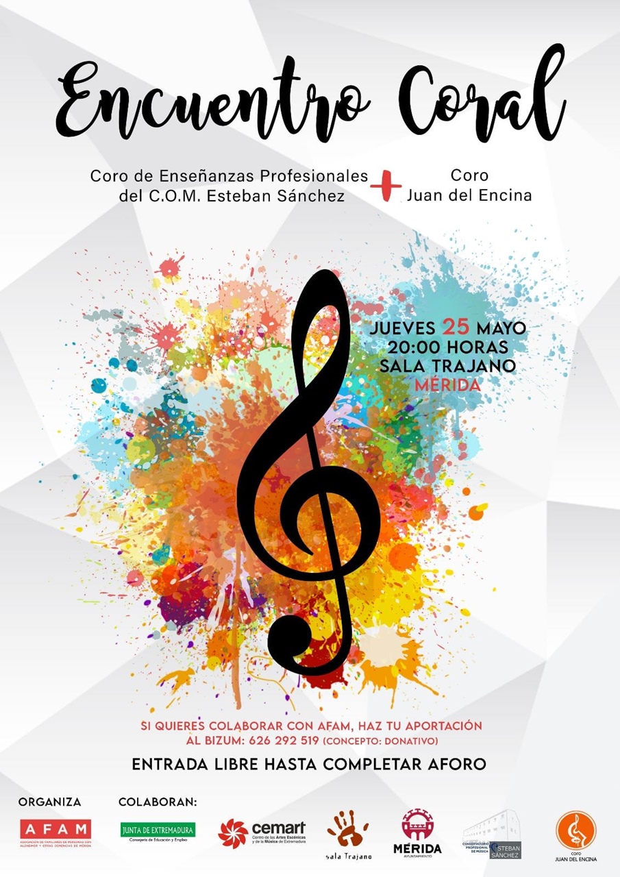 La Sala Trajano acoge un Encuentro Coral entre el Coro de Enseñanzas Profesionales del Conservatorio Profesional de Música Esteban Sánchez y el Coro Juan del Encina, el jueves 25 de mayo, a las 20:00 horas. Se trata de un encuentro musical solidario que se realiza a favor de AFAM con el fin de visibilizar, concienciar y ayudar. Entrada libre hasta completar aforo.