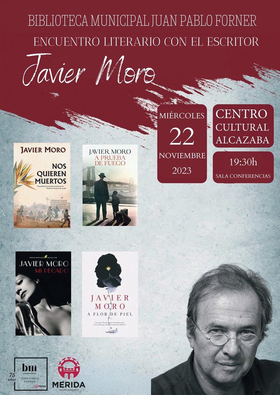 La Biblioteca Municipal Juan Pablo Forner ha organizado, para la próxima semana, un encuentro literario, con el escritor Javier Moro, que se enmarca dentro de las actividades programadas con motivo de la celebración de su 75 Aniversario. El escritor madrileño, uno de los autores actuales más queridos y respetados por la crítica del panorama literario español, mantendrá un encuentro en torno a su obra, que tendrá lugar, el miércoles 22 de noviembre, a las 19:30 horas en la sala de conferencias (3ª planta del Centro Cultural Alcazaba).