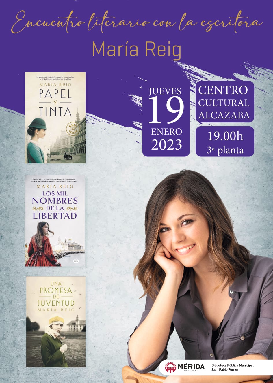 La autora María Reig mantendrá un encuentro literario el jueves 19 de enero, a las 19:00 horas, en el Centro Cultural Alcazaba. Organiza la Biblioteca Municipal Juan Pablo Forner de Mérida.