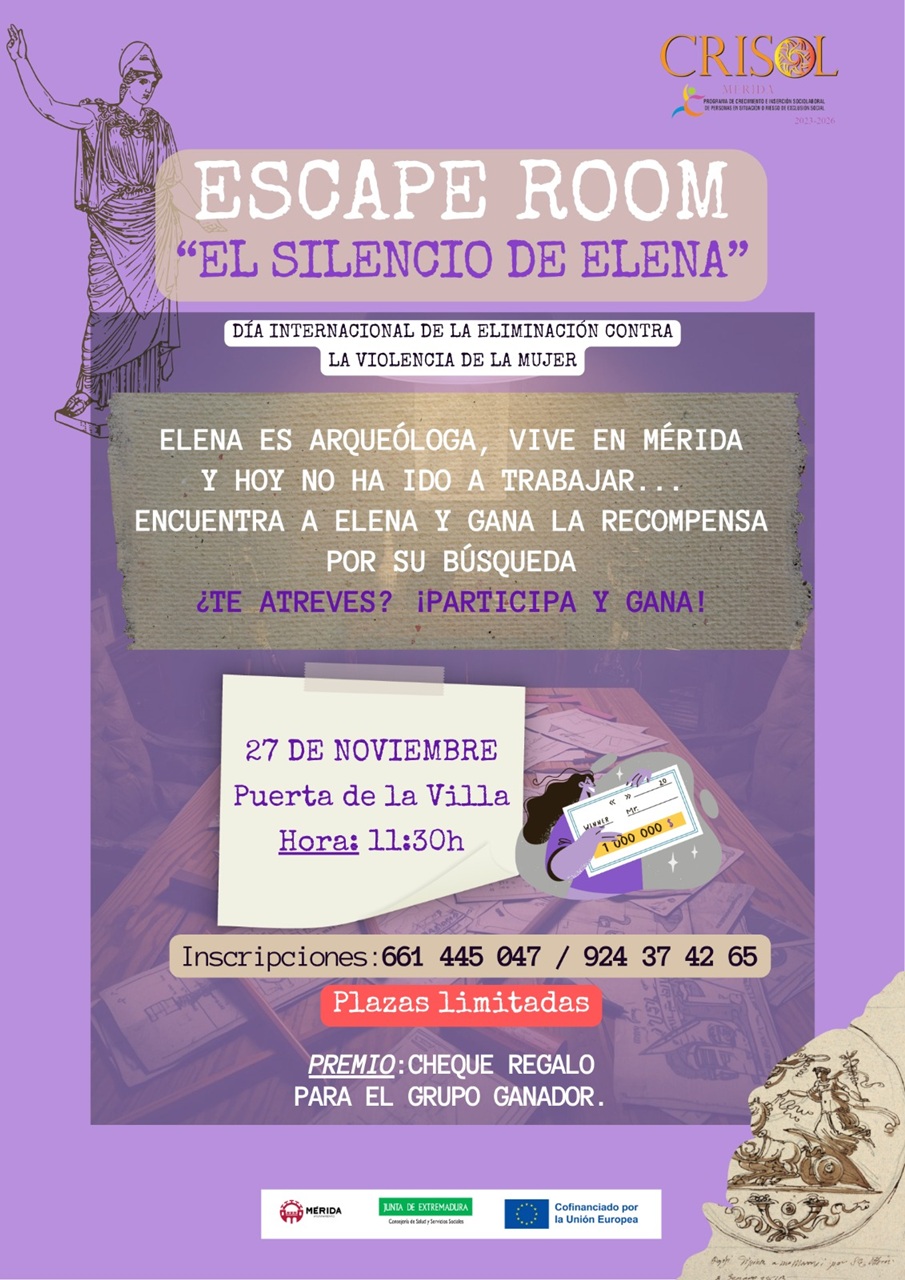 El Programa CRISOL (Programa de Crecimiento e Inserción Sociolaboral de Personas en situación o riesgo de exclusión social) Mérida celebrará el próximo 27 de noviembre el Escape Room “El silencio de Elena”, que se iniciará en la Puerta de la Villa a las 11:30 horas. Una actividad que se lleva a cabo con motivo del Día Internacional de la Eliminación contra la Violencia de la Mujer, que se conmemora cada 25 de noviembre.