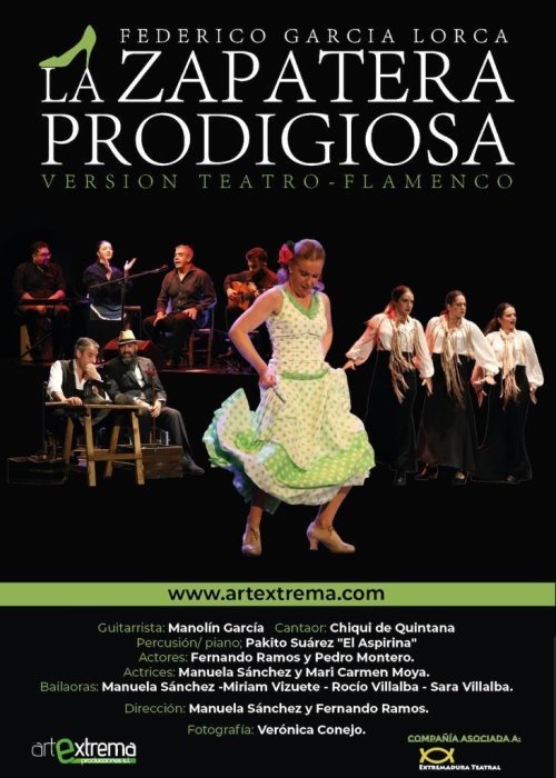 Sinopsis: La Zapatera Prodigiosa, «farsa violenta en dos actos” que nos ofrece una tragicómica fotografía muy precisa de la sociedad rural española de principios del siglo XX. Un zapatero vive dignamente de su oficio, se casa medio por amor, medio empujado; a ella, pobre y bella, le pasa otro tanto. Los hombres la acosan y la gente critica sin más pruebas que barruntos inducidos por la envidia y el resentimiento. La naturaleza humorística de la obra se verá transformada en llanto a medida que avanza, siendo el hilo conductor del dialogo la música y el baile. Temas compuestos para el montaje, junto con otras canciones populares de la época, darán vida a La Zapatera Prodigiosa más flamenca. Jaleos, alegrías, tangos, bulerías, caña y algunos temas más se representarán durante la obra, mostrando así la pasión por el flamenco que García Lorca plasmaba en la mayoría de sus obras.