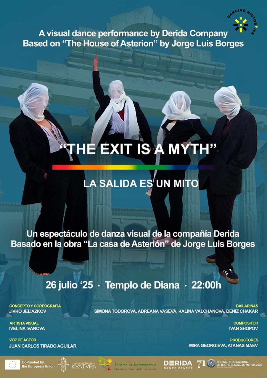 Descripción de la obra: La Salida Es Un Mito es un espectáculo de danza contemporánea que indaga en las profundidades de la psicología humana, el aislamiento y la identidad. Inspirada por la historia corta de Jorge Luis Borges “La Casa de Asterion”, el espectáculo reimagina el mito del Minotauro, no como un monstruo sino como una conciencia atrapada en un laberinto de miedos, prejuicios y soledad. A través de la expresión del movimiento, el espectáculo personifica la sensación de aprisionamiento, un ciclo sin fin de expectaciones y rechazos.