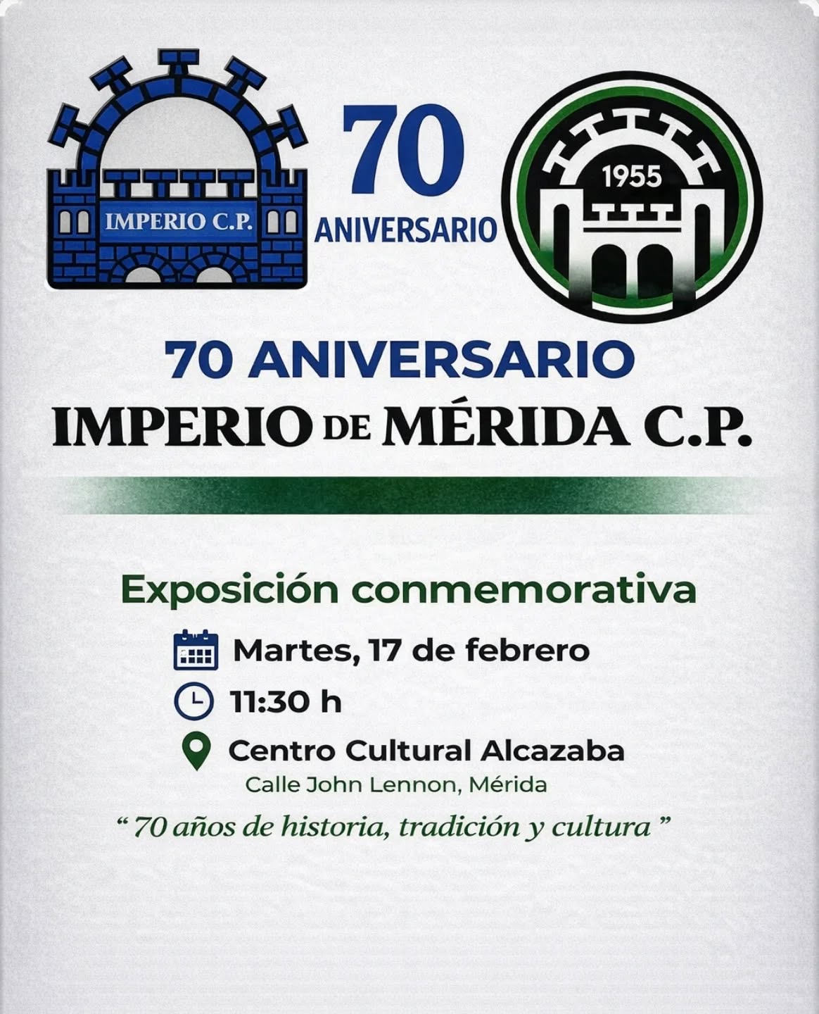 Del 17 al 28 de febrero puede verse en el Centro Cultural Alcazaba una exposición por el 70 aniversario Imperio de Mérida Club Polideportivo. Un homenaje a todas las generaciones de deportistas emeritenses que han pasado por el club que es también historia de la ciudad. Ofrece fotografías antiguas, camisetas, carteles, banderines o recortes de prensa de diferentes épocas y equipos del Imperio.