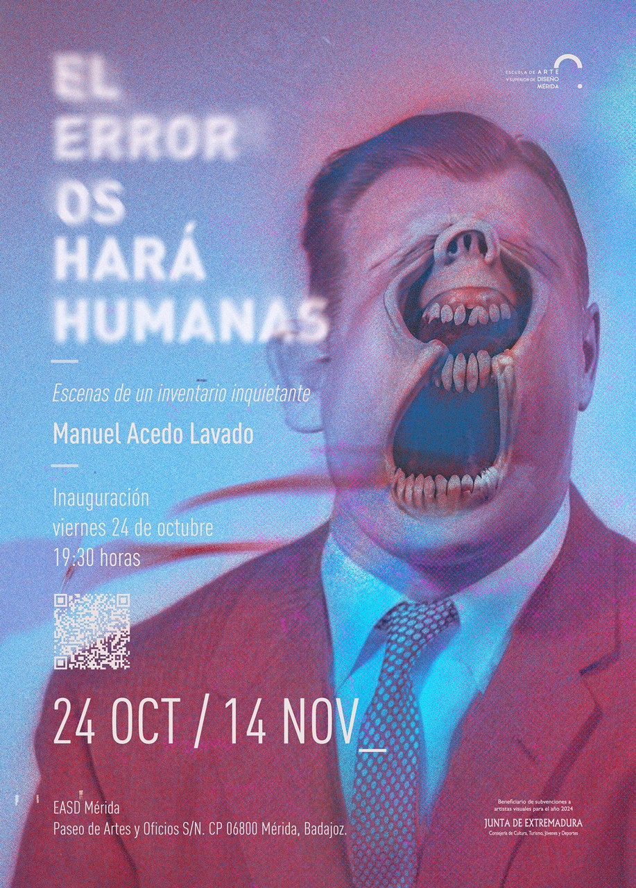 La Escuela de Arte y Superior de Diseño de Mérida acoge, del 24 de octubre al 14 de noviembre, la exposición «El error os hará humanas» de Manuel Acedo Lavado, una colección de collages digitales generados a partir de delirios visuales aportados por programas de redes neuronales, que nos revelan una verdad perturbadora: las máquinas no crean monstruos, los recuperan de nuestra propia memoria colectiva. Imitan nuestras imágenes, pero algo sale mal. La IA no imagina. Solo reorganiza lo que le damos. Y lo que le damos es nuestra propia sordidez.