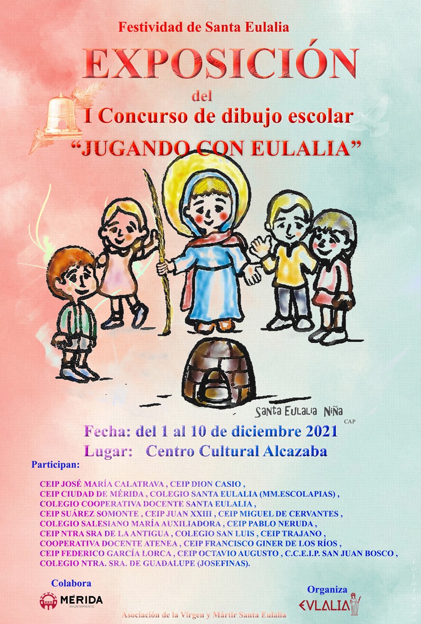 Con motivo de la Festividad de Santa Eulalia, del 1 al 10 de diciembre, el Centro Cultural Alcazaba acoge la exposición sobre el I Concurso de Dibujo Escolar ‘Jugando con Eulalia’ en el que han participado 19 colegios, con un total de 2.980 alumnos, y del que se expondrán dos dibujos por colegio. Organiza la Asociación de la Virgen y Mártir Santa Eulalia