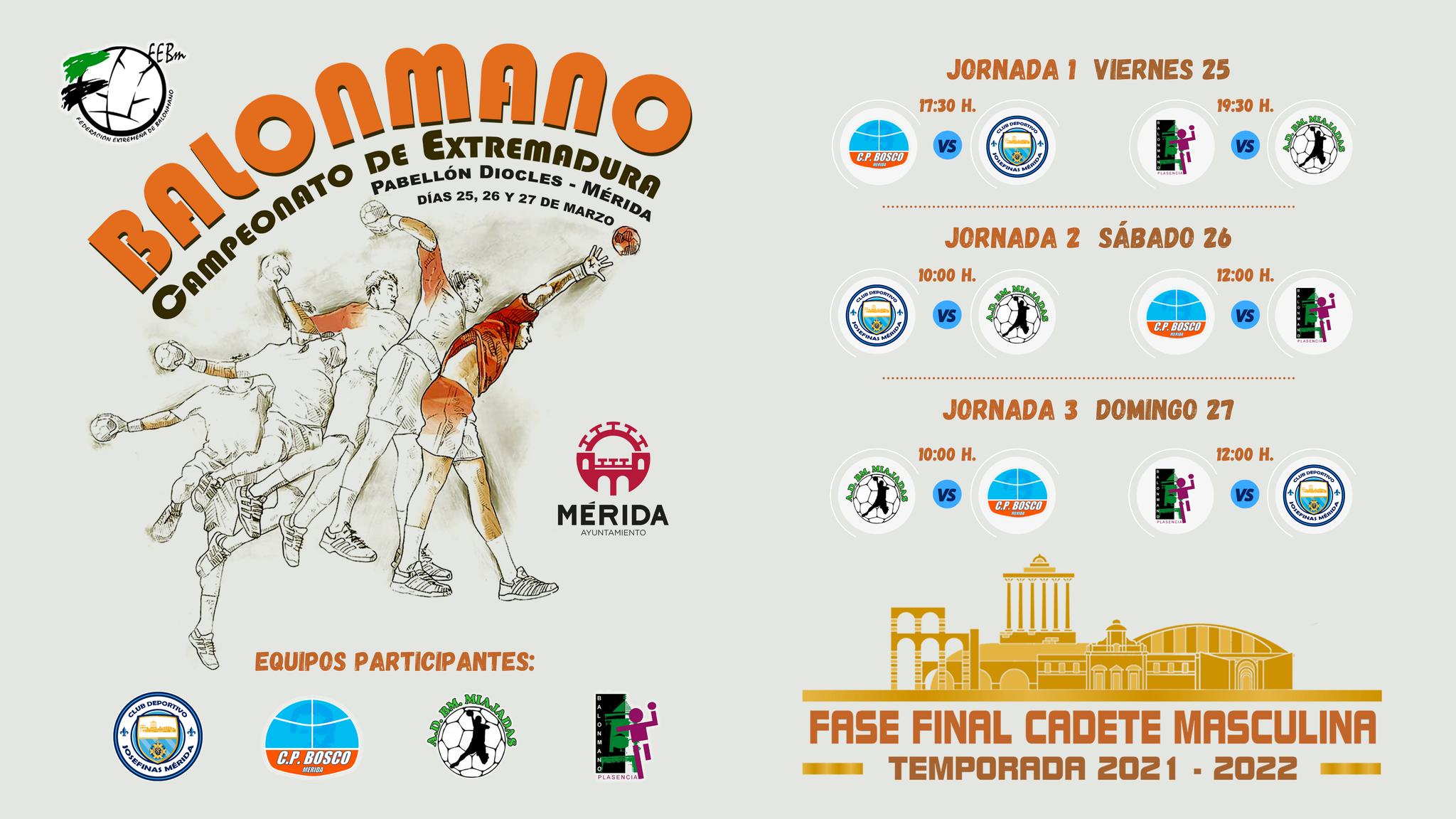 Del 25 al 27 de marzo, se disputa, en el Pabellón Diocles, la Fase Final Cadete del Campeonato de Extremadura de Balonmano con la participación de los equipos emeritenses Club Deportivo Josefinas Mérida y CP Bosco Mérida, además de la AD Balonmano Miajadas y Balonmano Plasencia. Organiza Federación Extremeña de Balonmano con la colaboración del Ayuntamiento