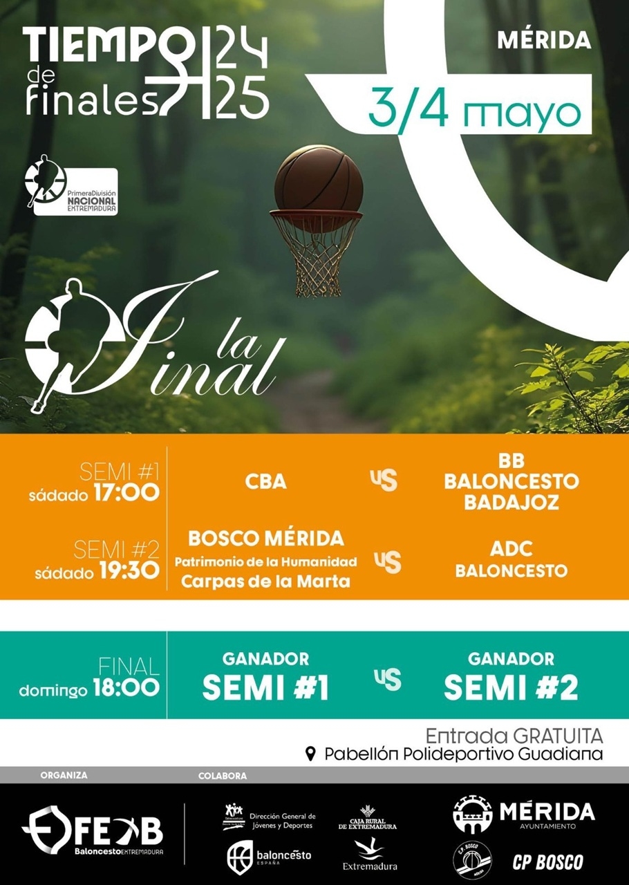 El Pabellón Guadiana acoge los días 3 y 4 de mayo la Fase Final de la Primera Nacional Extremadura de Baloncesto con la participación del CP Bosco de Mérida, Baloncesto Badajoz, ADC Baloncesto de Cáceres y CBA de Badajoz. Las semifinales son el sábado 3 y la gran final el domingo 4 de mayo. Entrada gratuita