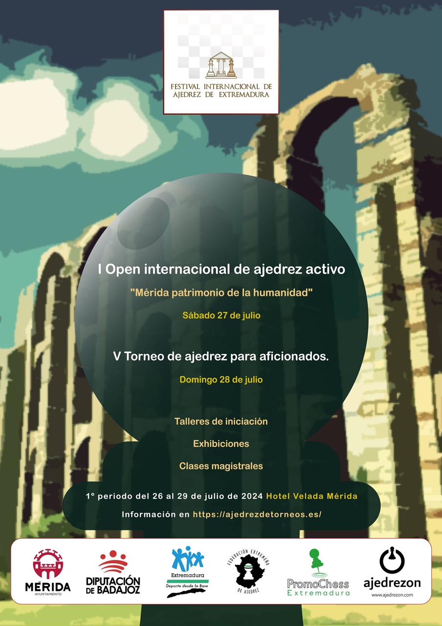 El sábado 27 de julio se celebrará, en el Hotel Velada Mérida, el I Open Internacional de Ajedrez Activo y al día siguiente, domingo 28 de julio, el V Torneo de Ajedrez para Aficionados dentro de las actividades del Festival Internacional de Ajedrez que organiza la Federación Extremeña de Ajedrez junto al Club Cibeles de Mérida. En el evento también habrá talleres, exhibiciones y clases magistrales.
