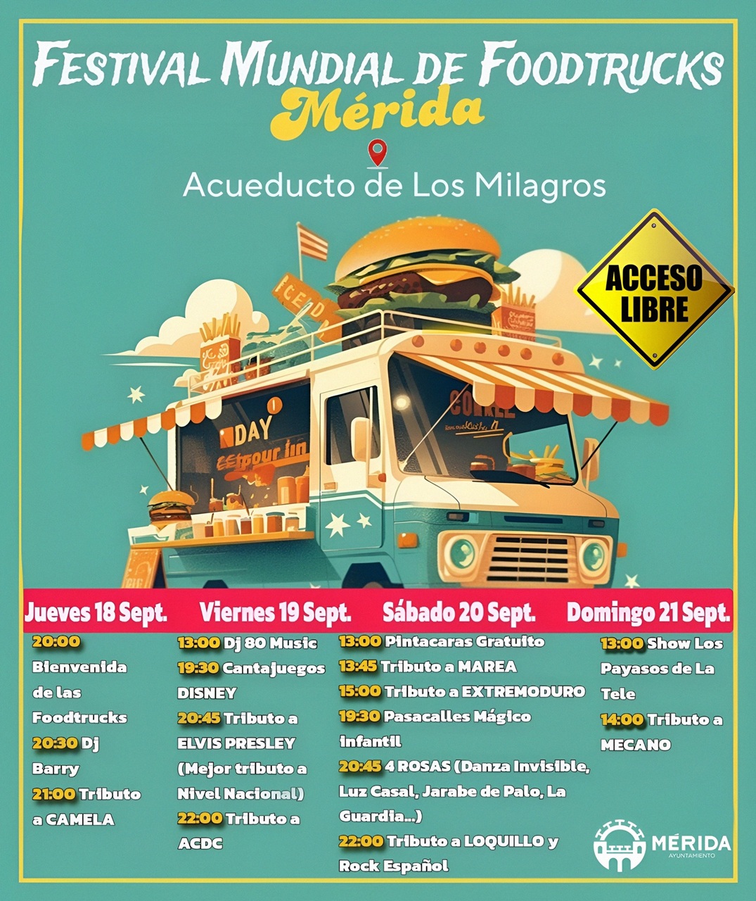 Del jueves 18 al domingo 21 de septiembre, el Acueducto de Los Milagros acogerá el Festival Mundial de FoodTrucks, un evento en el que se podrá degustar la mejor comida local e internacional y que también tendrá música en vivo y actividades infantiles.