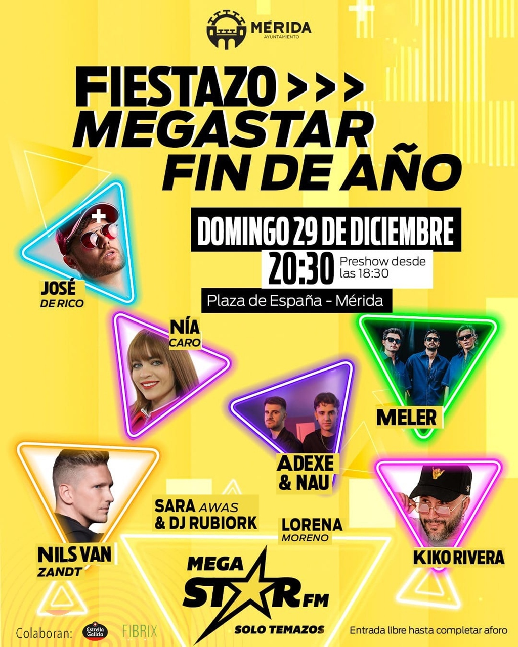 El domingo 29 de diciembre, a partir de las 18:30 horas, la Plaza España acoge, un año más, el Fiestazo Preuvas Fin de Año de la mano de MegaStarFM con un espectáculo que se prolongará hasta la 1:30 de la madrugada con diferentes artistas. Estarán Jose De Rico, Nia Caro, Meler, Adexe Y Nau, Kiko Rivera o el holandés Nils Van Zandt. También los artistas locales Sara Awas junto a DJ Rubiork y Lorena Moreno.