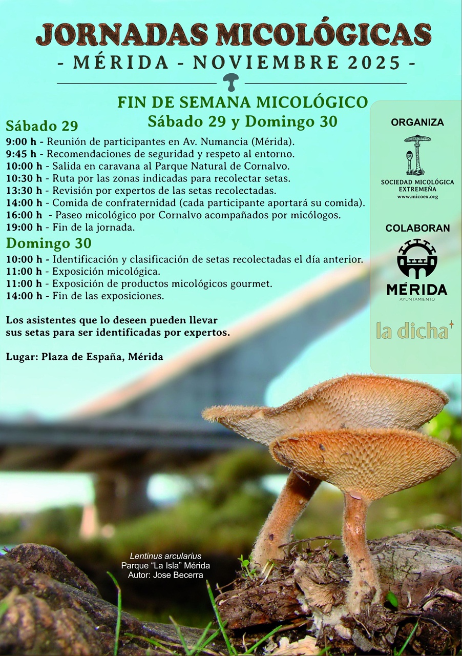 Tras las Jornadas Micológicas celebradas durante lo martes de noviembre, el último fin de semana del 29 y 30 del mismo mes, la Sociedad Micológica Extremeña organiza un Fin de Semana Micológico que incluye una visita al Parque Natural de Cornalvo y exposición de las setas recolectadas además de una comida de convivencia.