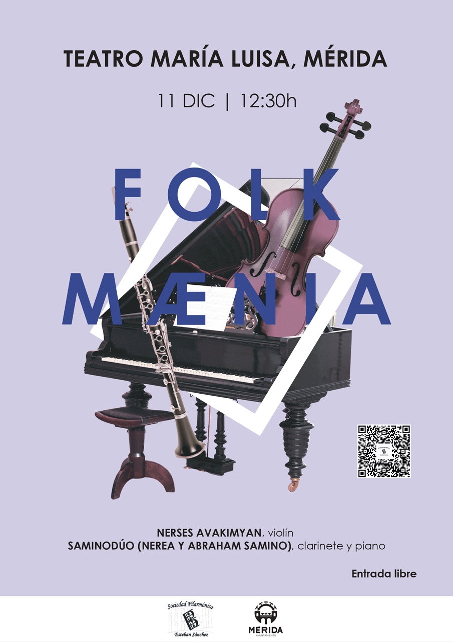 El Teatro María Luisa acogerá el lunes 11 de diciembre, festivo local, a las 12:30 horas, el espectáculo musical ‘Folkmænia’ a cargo de Saminodúo (Abraham Samino, piano y Nerea Samino, clarinete) y el violinista Nerses Avakimyan que presentarán un programa de música clásica del siglo XX, con una absoluta y especial presencia folklórica y popular, donde cabe destacar la cultura armenia, país de origen del violinista. Entrada libre hasta completar aforo.