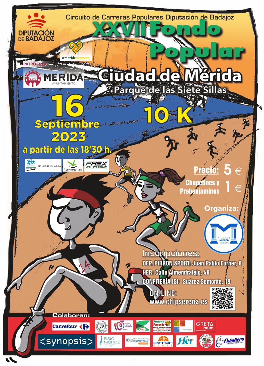 El próximo sábado 16 de septiembre de 2023, a partir de las 18:30 horas, se celebra el XXVII FONDO POPULAR CIUDAD DE MÉRIDA, con salida y llegada en el Parque de las Siete Sillas. El precio de inscripción es de 5 euros (1€ para chupetines y prebenjamines). Organiza Club Atletismo Mitreo, en el marco del Circuito de Carreras Populares impulsado por la Diputación de Badajoz, con el patrocinio del Ayuntamiento de Mérida.