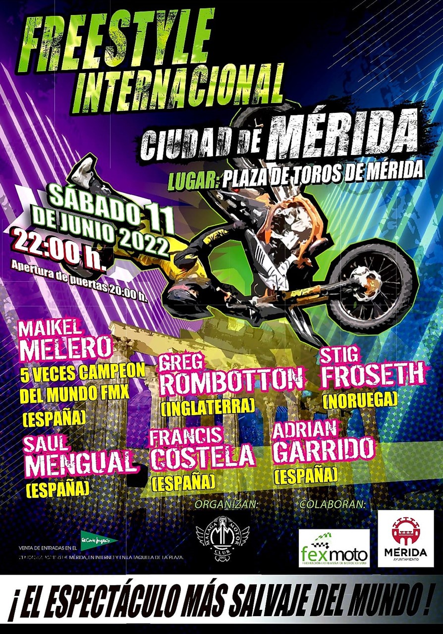 La Plaza de Toros de Mérida acogerá el próximo sábado, 11 de junio, a partir de las 22:00 horas, el Freestyle Internacional Ciudad de Mérida. Podrás disfrutar de las acrobacias de Maikel Melero (5 veces campeón del mundo FMX), Saul Mengual (España), Francis Costela, Greg Rombotton (Inglaterra), Stig Froseth (Noruega) y Adrián Garrido (España).
