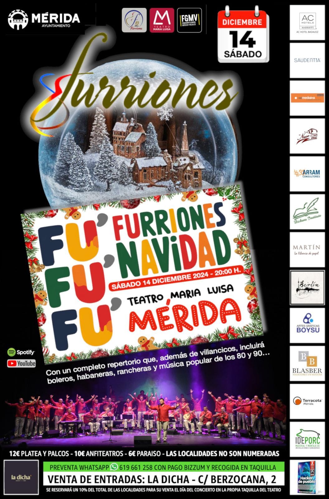 El sábado 14 de diciembre, a las 20:00 horas, el Teatro María Luisa acoge el concierto del grupo extremeño FURRIONES que interpretarán un completo repertorio que, además de Villancicos, incluye boleros, habaneras, rancheras y música popular de los 80 y 90.