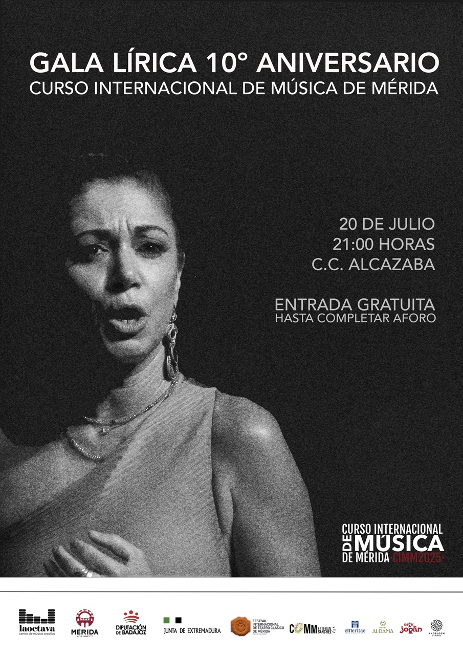 El domingo 20 de julio a las 21:00 horas en el Auditorio del Centro Cultural Alcazaba de Mérida se celebrará la GALA LÍRICA 10º ANIVERSARIO CIMM (Curso Internacional de Música de Mérida). El concierto correrá a cargo del alumnado del CIMM´25 en la especialidad de Canto e Interpretación, impartido por la soprano Carmen Solís, el director y actor David García y la mezzosoprano Ruth García.