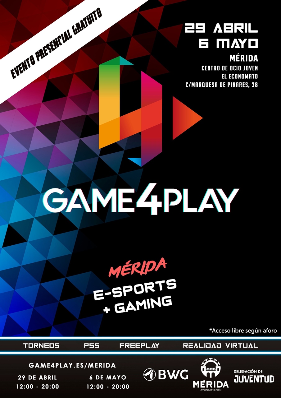 Los videojuegos y el ocio digital llegan a Mérida los días 29 de abril y 6 de mayo, en horario de 12.00 a 20.00 horas, con el evento Game4Play que organiza la delegación de Juventud del Ayuntamiento en colaboración con la promotora de eventos Best Way Group, una cita enfocada a divertir a los jóvenes de forma completamente gratuita. Tendrá lugar en el Economato (aunque todavía se podría cambiar la ubicación del mismo), donde se encontrarán múltiples actividades de acceso libre relacionadas con el universo del ocio electrónico y la competición.