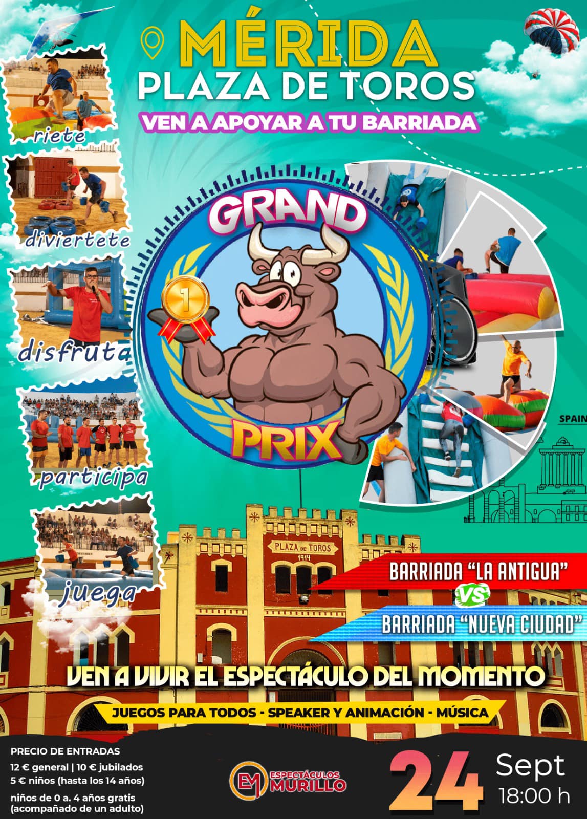 El domingo 24 de septiembre, a partir de las 18:00 horas, la Plaza de Toros acogerá el espectáculo del ‘Gran Prix’ con dos equipos participantes, uno de la barriada La Antigua (rojo) y otro de Nueva Ciudad (azul). Habrá pruebas divertidas con muchos castillos hinchables y pruebas de agua con más de 10.000w de sonido con una gran animación toda la noche. Organiza Espectáculos Murillo