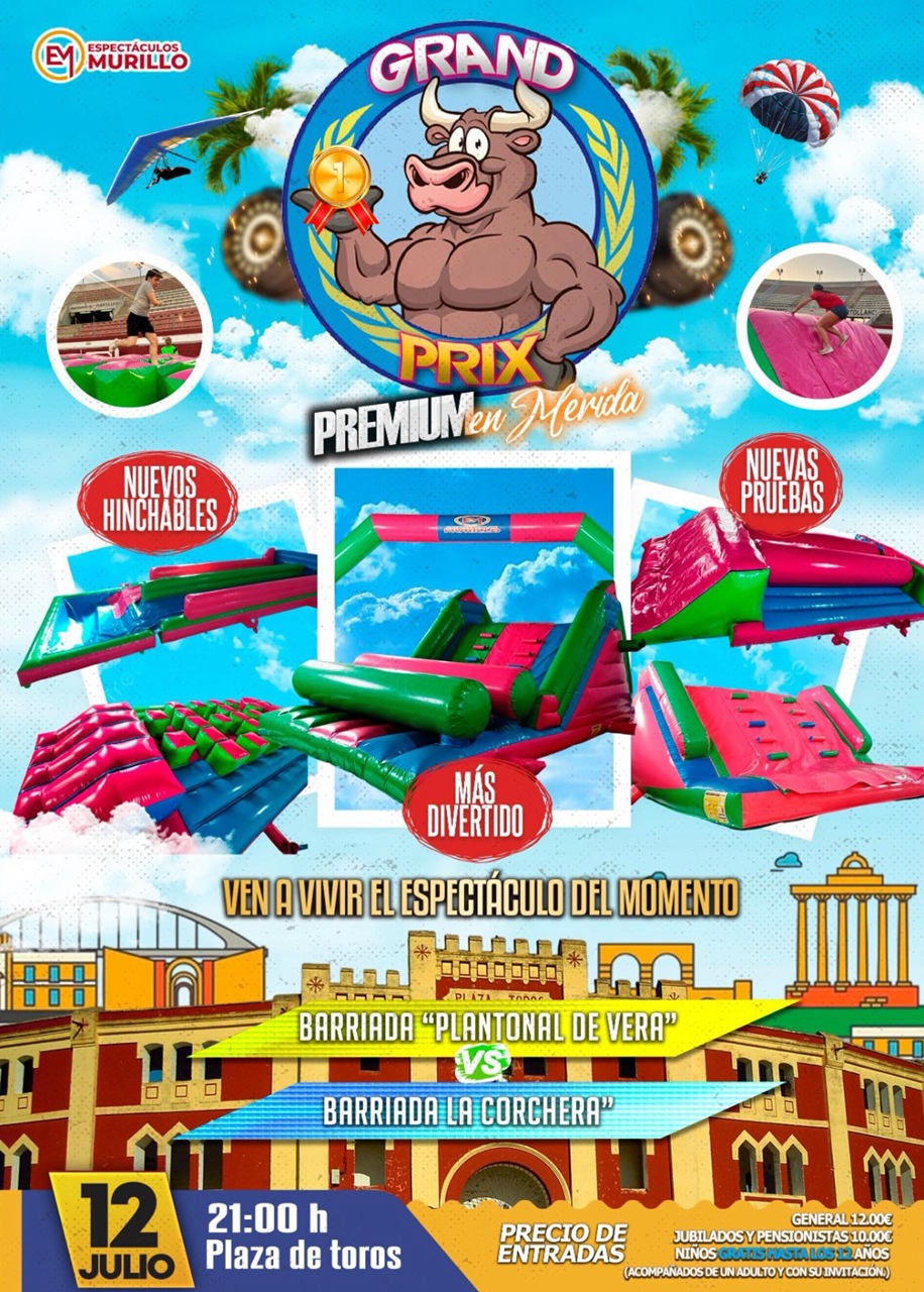 El sábado 12 de julio, a partir de las 21:00 horas, la Plaza de Toros acogerá el espectáculo del ‘Grand Prix Premium Mérida’ con dos equipos participantes, uno de la barriada Plantonal de Vera (amarillo) y otro de La Corchera (azul). Habrá pruebas divertidas con muchos castillos hinchables y pruebas de agua con más de 10.000w de sonido con una gran animación toda la noche. Organiza Espectáculos Murillo