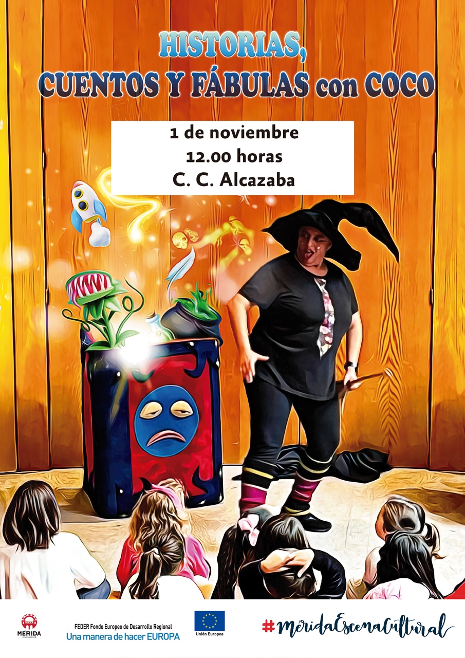 Vuelve HISTORIAS, CUENTOS y FÁBULAS CON COCO al Centro Cultural Alcazaba (en lugar del Templo de Diana como inicialmente estaba previsto), el miércoles 1 de noviembre. Se trata de un espectáculo de narración oral donde la magia de los cuentos hará que los niños y niñas vivan la fantasía, diversión y muchas emociones con las historias contadas. Cuentos de animales, brujas, ogros, donde se transmiten valores como el respeto, la amistad, cooperación, etc. Público infantil.