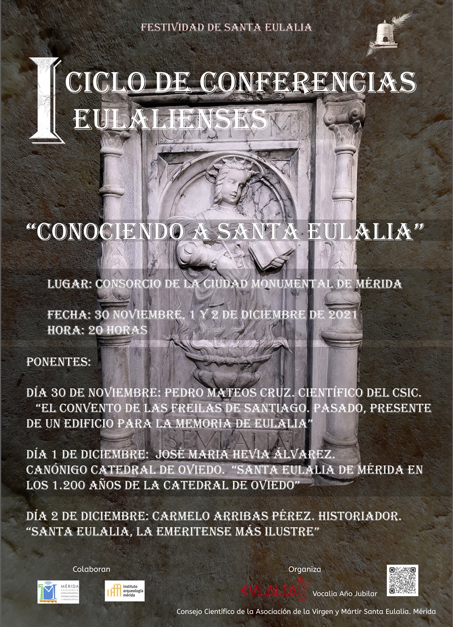 Del 30 de noviembre al 2 de diciembre, con motivo de la Festividad de Santa Eulalia, se desarrollará el I Ciclo de Conferencias Eulalienses ‘Conociendo a Santa Eulalia’, en la Sede del Consorcio, a partir de las 20:00 horas.