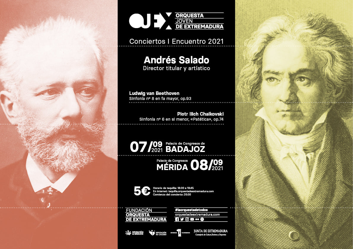 La formación, dirigida por Andrés Salado, su director titular y artístico y ahora también de la OEX, ha preparado un programa con la Octava Sinfonía de Beethoven, su sinfonía más alegre y despreocupada, incluso tocada por buen humor. Y en contraposición, la Sexta de Chaikovski que, aunque conocida como la «Patética», su traducción del ruso significa realmente ampulosa, apasionada o emotiva; como el propio autor escribió: «está llena de sentimientos subjetivos y con frecuencia, mientras la componía, mis ojos se llenaron de lágrimas».