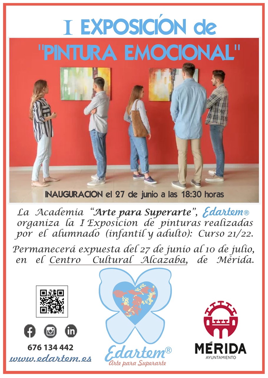 Del 27 de junio al 10 de julio de 2022, se podrá visitar, en el Centro Cultural Alcazaba, la I Exposición de ‘Pintura Emocional’ del alumnado de la Academia “EDARTEM, ARTE para SUPERARTE”. Una selección de las mejores pinturas realizadas por el grupo infantil y adulto, durante este curso 2021/2022 que llenarán los pasillos de la sala de Exposiciones del centro.
