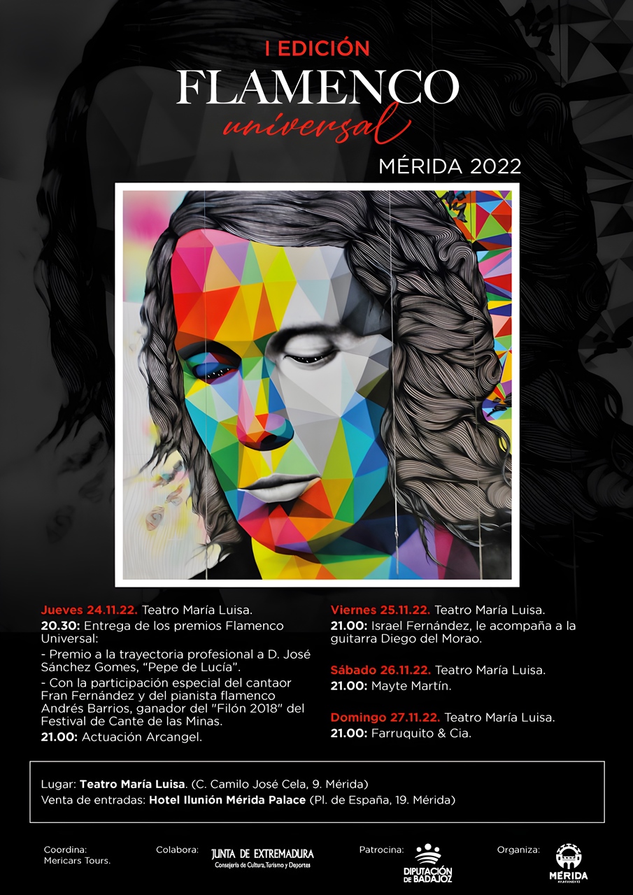 Del 24 al 27 de noviembre, el Teatro María Luisa acogerá la I edición del Festival Flamenco Universal de Mérida, una cita organizada por el Ayuntamiento de Mérida con un magnífico cartel con grandes figuras nacionales e internacionales.