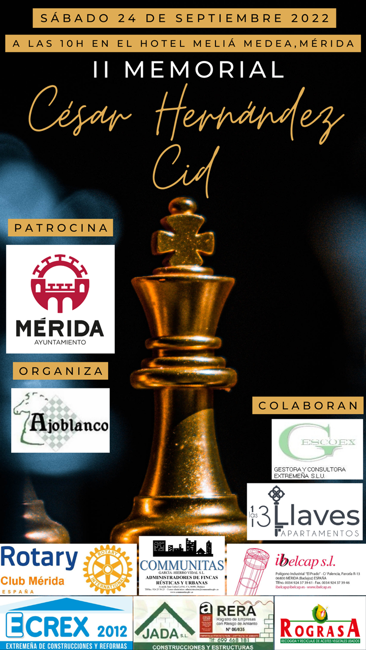 El Club Ajoblanco de Ajedrez organiza el próximo sábado 24 de septiembre, desde las 10:00 horas, el II Memorial de Ajedrez ‘César Hernández Cid’ en el Hotel Mérida Medea. Cuenta con el patrocinio del Ayuntamiento de Mérida.