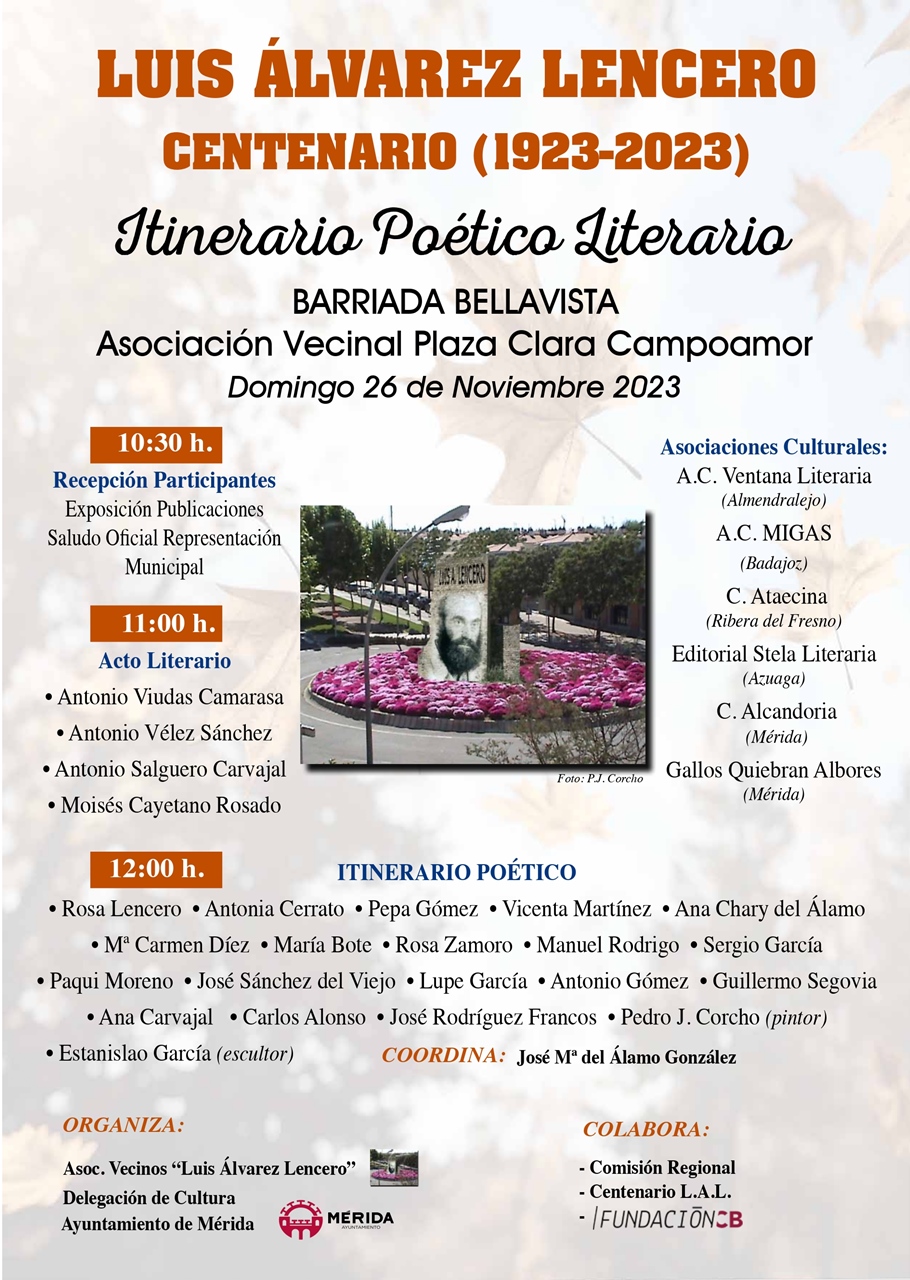 La Asociación Luis Álvarez Lencero de la Barriada de Bellavista organiza un Itinerario Poético Literario en homenaje a Luis Álvarez Lencero en el centenario de su nacimiento (1923-2023) con la participación de diferentes personalidades del mundo de la cultura. Coordina José María del Álamo. La concentración será a las 10:30 horas en la Plaza Clara Campoamor. Colabora el Ayuntamiento de Mérida