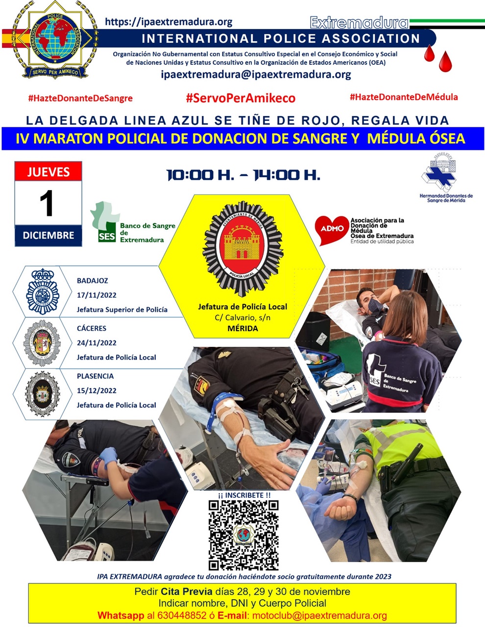 La Policía Local colabora con la International Police Association en el IV Maratón Policial de Donación de Sangre y Médula Ósea, el jueves 1 de diciembre, de 10 a 14 horas.