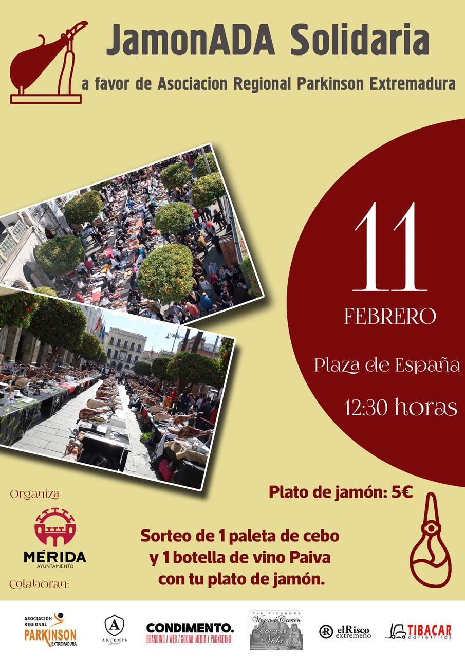 El domingo 11 de febrero, a partir de las 12:30 horas, coincidiendo con la celebración del Carnaval Romano 2024, se celebrará, en la Plaza de España, una JamonADA Solidaria a favor de la Asociación Regional Parkinson Extremadura.