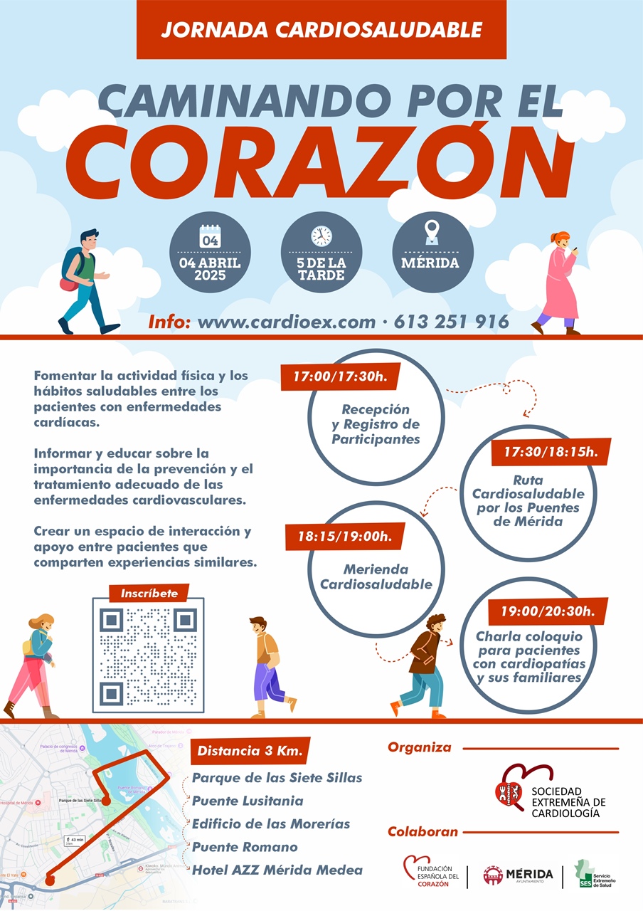 El viernes 4 de abril, a partir de las 17:00 horas, la Sociedad Extremeña de Cardiología organiza una Jornada Cardiosaludable «Caminando por el corazón» que incluye una marcha de unos 3 km por los puentes de Mérida con salida desde el Parque de las VII Sillas y llegada al Hotel AZZ Mérida Medea, una merienda en dicho hotel y un charla-coloquio para pacientes con cardiopatías y familiares.