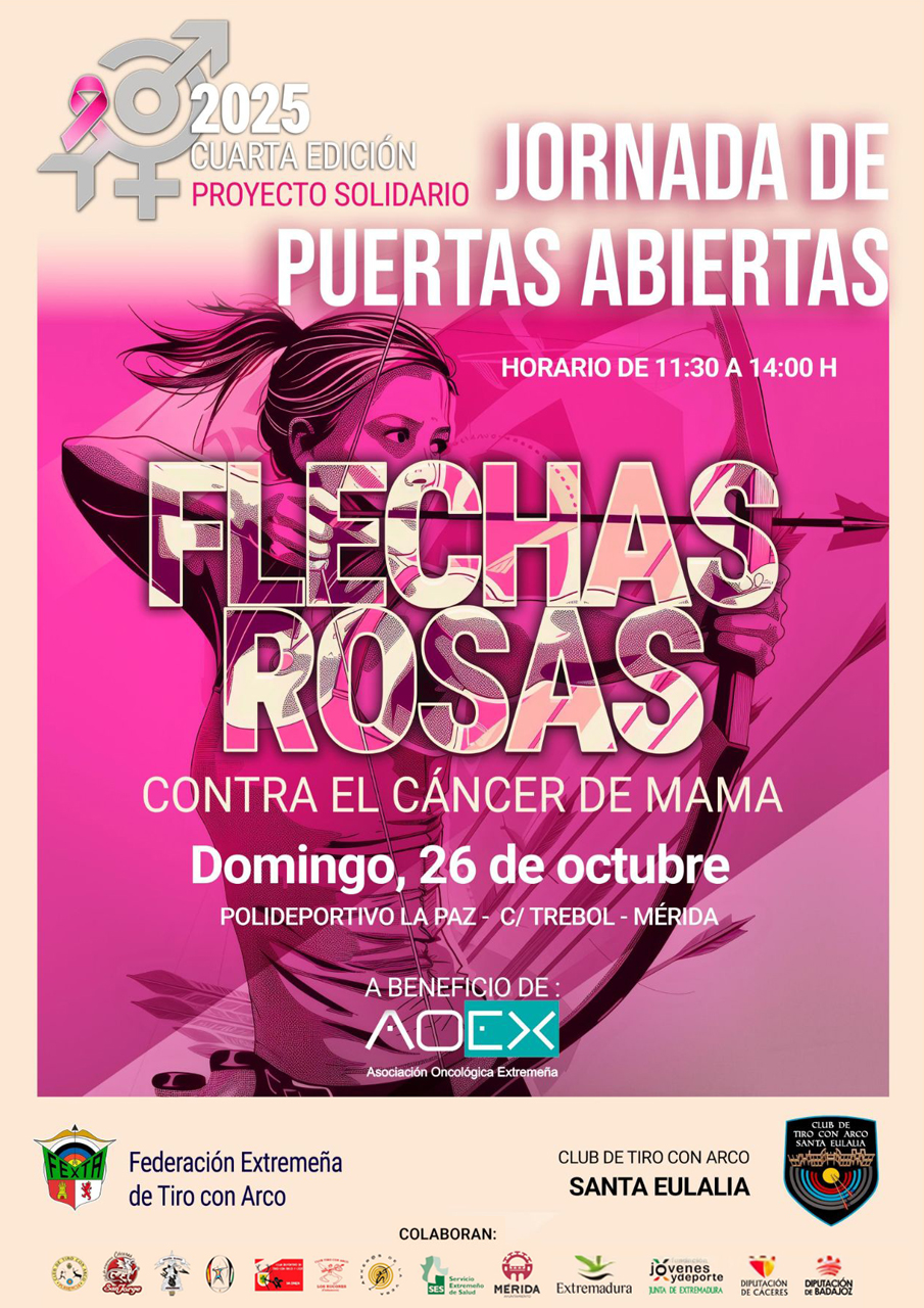 El Club de Tiro con Arco Santa Eulalia organiza una jornada de puertas abiertas ‘Flechas Rosas contra el Cáncer de Mama’ a beneficio de AOEX Extremadura. Se trata de una iniciativa de la Federación Extremeña de Tiro con Arco que, coincidiendo con el día mundial contra el cáncer de mama, se desarrollará durante el mes de octubre a través de jornadas de puertas abiertas en diferentes localidades de la comunidad. En Mérida, será en el Polideportivo de La Paz, el domingo 26 de octubre, de 11:30 horas a 14:00 horas.