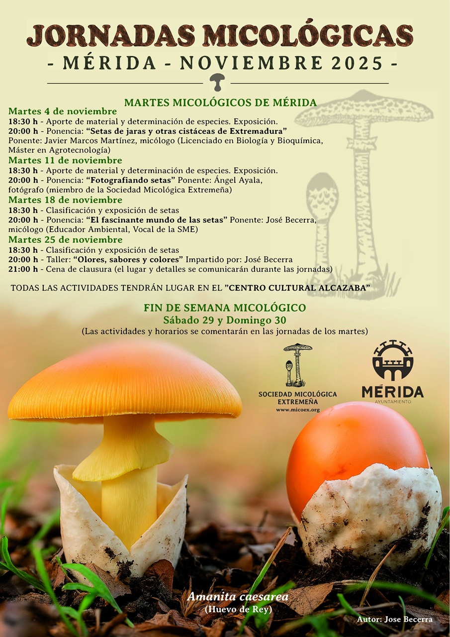 La Sociedad Micológica Extremeña organiza durante el mes de noviembre los ‘Martes Micológicos de Mérida’ con diferentes ponencias todos los martes, a partir de las 20:00 horas, en el Centro Cultural Alcazaba. Antes, desde las 18:30 horas, clasificación y exposición de setas.