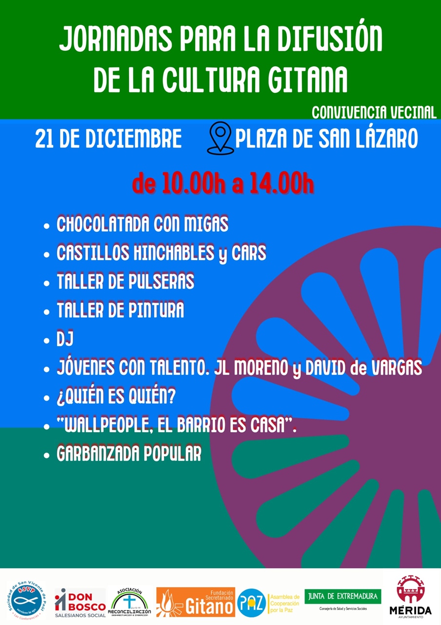 La Plaza de San Lázaro acogerá el sábado 21 de diciembre unas jornadas para la Difusión de la Cultura Gitana con diferentes actividades como chocolatada con migas, Talleres infantiles, Música, Juegos y Garbanzada en un día de convivencia vecinal.