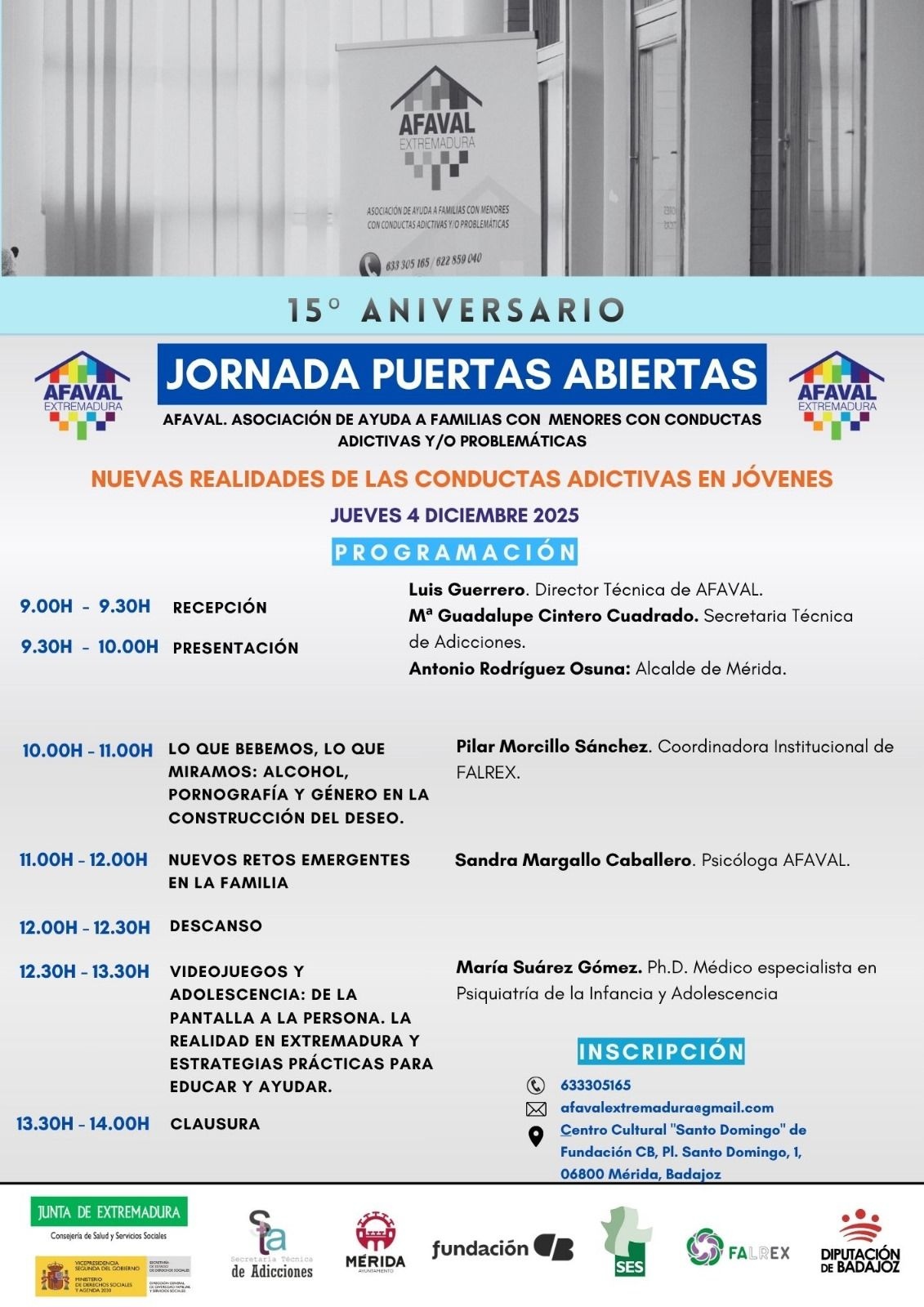 El jueves 4 de diciembre de 2025, AFAVAL (Asociación De Ayuda A Familias Con Menores Con Adicciones) celebra sus Jornadas de Puertas Abiertas en el Centro Cultural Santo Domingo de Fundación CB con numerosas ponencias dirigidas a profesionales y familias.