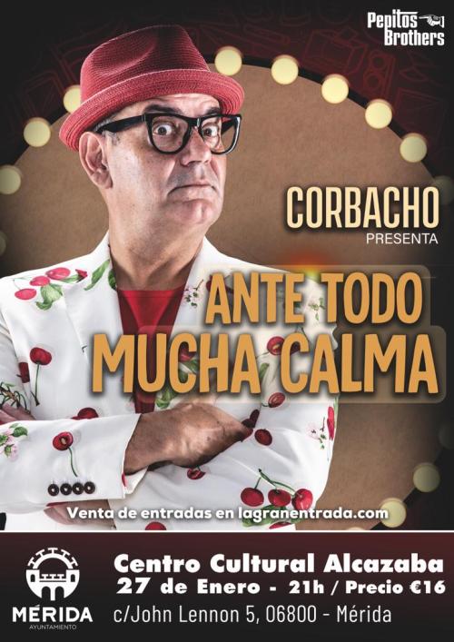 ‘Ante todo mucha calma’ es un monólogo en el que Corbacho se ríe de todo, pero, básicamente ¡de sí mismo!, Bueno, y también de su familia, de sus padres, de su mujer, de su hijo, de su perro, y… de sus principios. Y puestos a reírse, se ríe hasta de los espectadores que van a verlo, pero sobre todo lo que pretende es que los que se rían más sean ellos. Porque está la cosa cómo para dejar de reírse.