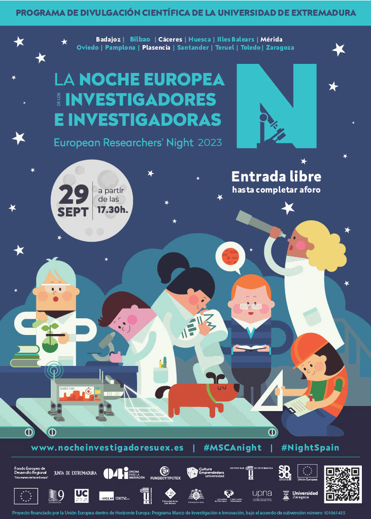 La Universidad de Extremadura (Servicio de Difusión de la Cultura Científica) organiza, un año más, ‘La Noche Europea de los Investigadores e Investigadoras’, el viernes 29 de septiembre de 2023, en los diferentes campus universitarios de la región con el objetivo de acercar el conocimiento científico al público en general, y en particular a los más jóvenes, y promover la visibilidad de sus investigadores. Las actividades consisten en experimentos, demostraciones, juegos, exposiciones y retos.