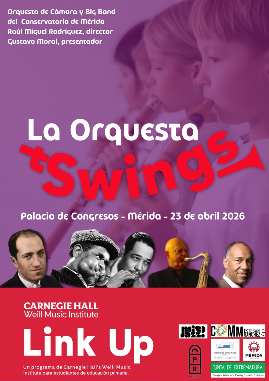 El Palacio de Congresos albergará el 23 de abril un concierto de la Orquesta Swings, una orquesta de Cámara y Big Band del Conservatorio de Mérida con Raúl Miguel Rodríguez como director. Presenta Gustavo Moral.