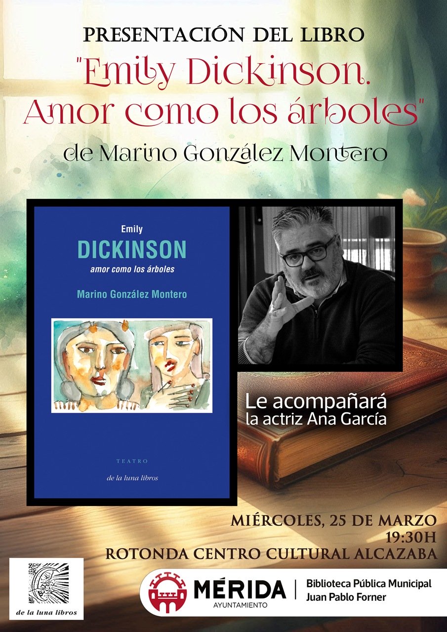 La Biblioteca Municipal ‘Juan Pablo Forner’ de Mérida y la Editorial la Luna Libros presentan el libro de teatro ‘Emily Dickinson. Amor como los árboles’ de de Marino González Montero, el próximo miércoles 25 de marzo, a las 19:30 horas, en la Rotonda del centro Cultural Alcazaba. Se trata de un apasionante texto teatral en el que dos mujeres nos llevaran a conocer a esta increíble poeta norteamericana». Le acompañará la actriz Ana García.