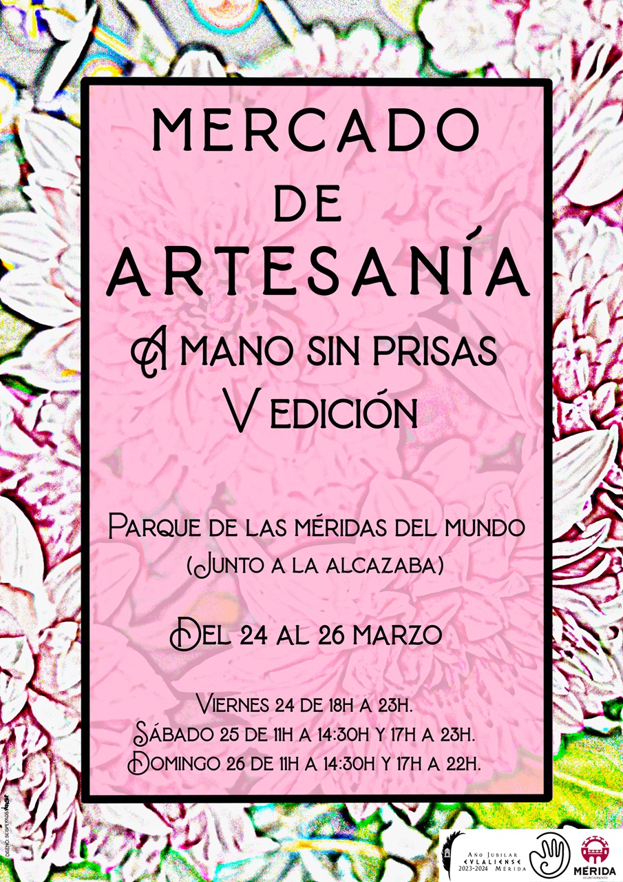 La Asociación “A mano sin prisas” organiza, desde el viernes 24 al domingo 26 de marzo, la V edición de su mercado artesano en el Parque de las Méridas del Mundo con la presencia de diferentes puestos de artesanía en textil, cuero, ganchillo, crochet, bisutería, cerámica, ámbar, jabones, productos infantiles, etc.