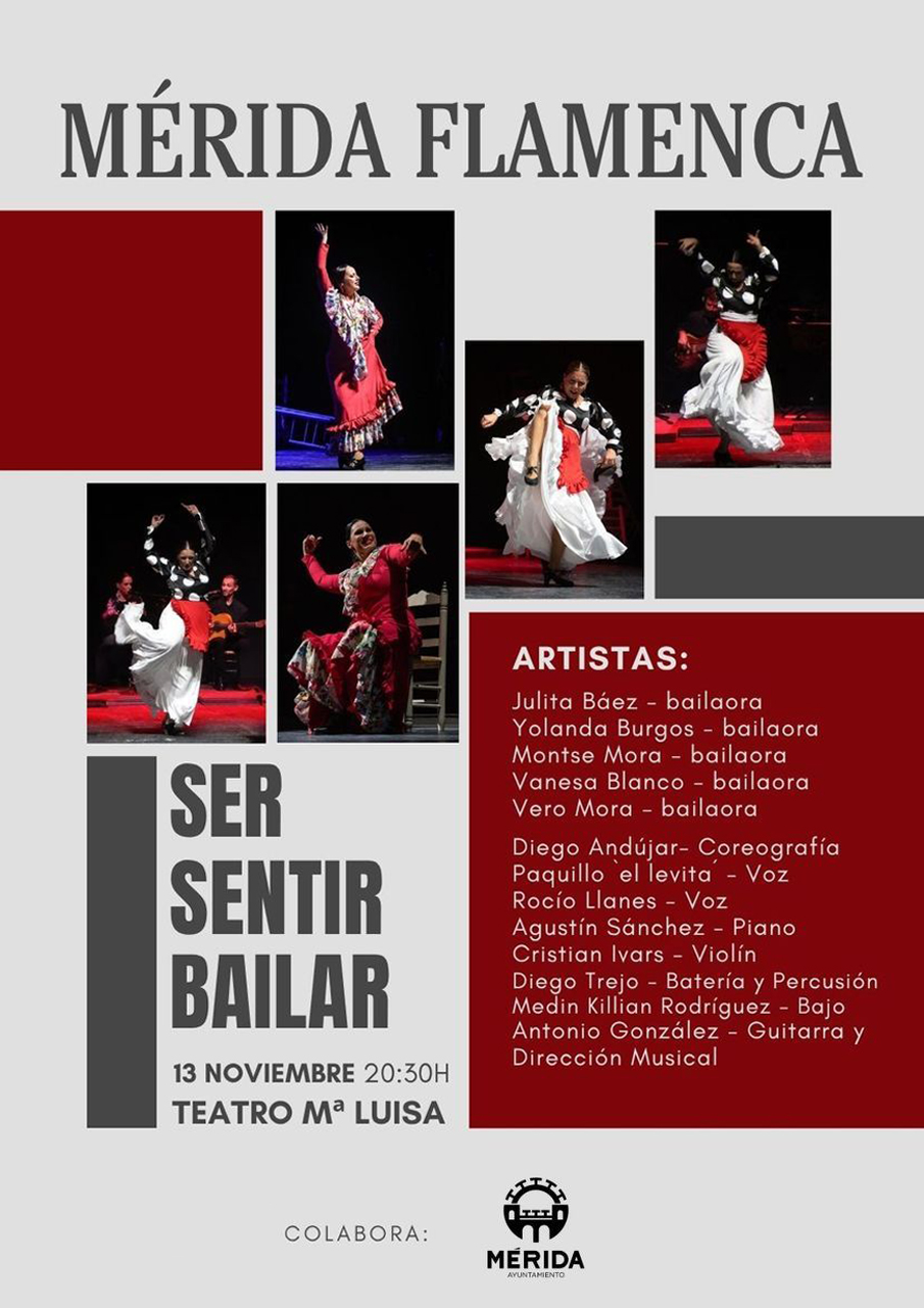 El jueves 13 de noviembre, a las 20:30 horas, el Teatro María Luisa acoge el nuevo espectáculo ‘Ser Sentir Bailar’ de Mérida Flamenca compuesta por Julita Báez, Yolanda Burgos, Vero Mora, Vanesa Blanco y Montse Mora y con la dirección musical de Antonio González.