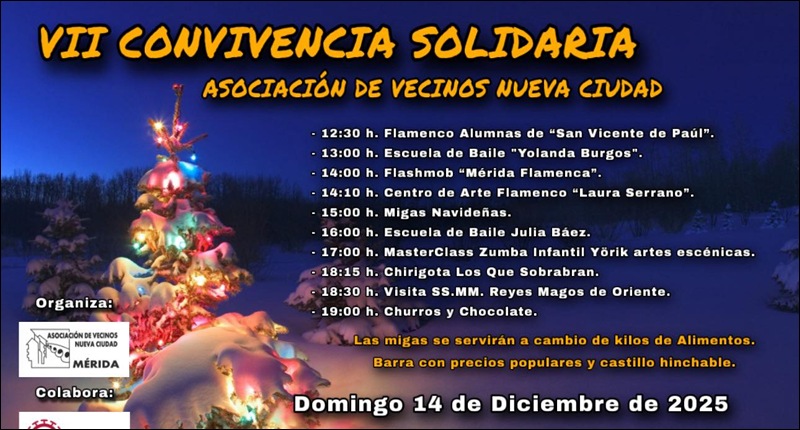 La Asociación de Vecinos de Nueva Ciudad organiza la VII Convivencia Navideña, el domingo 14 de diciembre, a partir de las 12:30 horas, en la Plaza de Gabriel y Galán, con numerosas actuaciones musicales y la visita de los Reyes Magos. Habrá migas solidarias y barra con precios populares