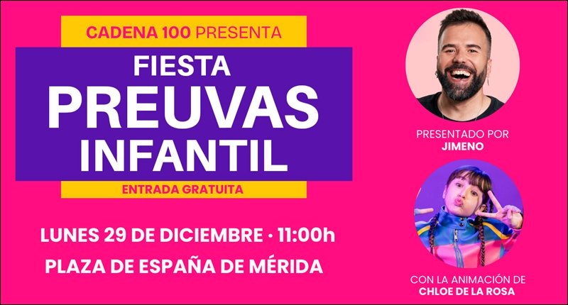 El lunes 29 de diciembre, a partir de las 11:00 horas, podremos disfrutar en la Plaza de España de la Fiesta de Preuvas Infantil presentado nuevamente por Jimeno, locutor de Cadena 100, y la animación de Chloe DelaRosa. Diversión, juegos, regalos y la mejor variedad musical para el disfrute de los más pequeños